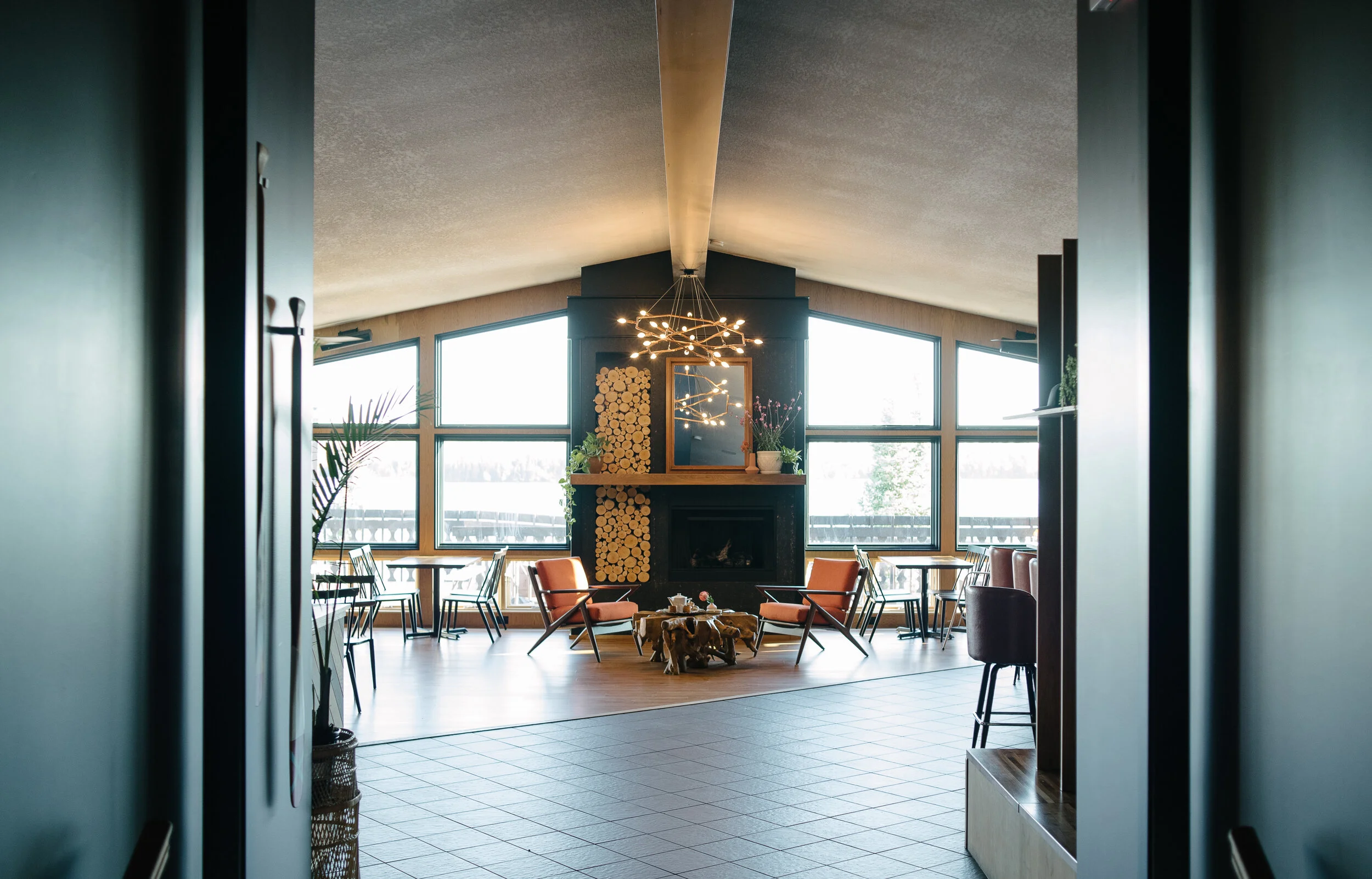 Modern north woods cozy meets minimal 70s vibes. Clean lines used throughout the design add to the angular drama of the space and draw your gaze to the custom windows framing gorgeous views of Poplar Lake, the surrounding woods, and breathtaking sunsets. Natural and durable materials were used for their beauty and functionality.